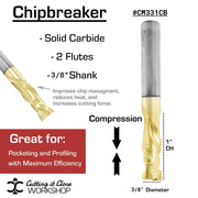The 3/8" Chipbreaker Compression Bit is built for serious material removal with flawless edge quality. Featuring a 1" cut length and a chipbreaker flute design. The compression delivers clean surfaces on both sides of your material, making it ideal for cabinetry, signage, furniture parts, and high-speed CNC production where speed and precision matter.