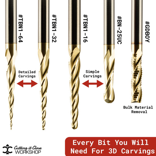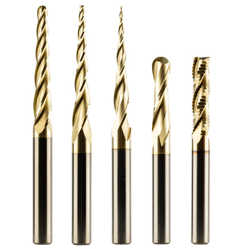 Take your 3D carving to the next level with the complete roughing-to-finish lineup. This 5-bit set includes Golden Boy for aggressive material remo...
