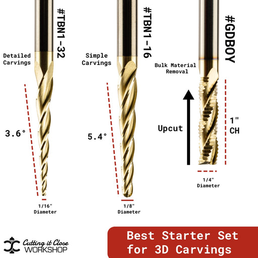 Start carving with confidence using the perfect 3-bit combo for smooth, detailed 3D projects. This set pairs the 1/32" and 1/16" tapered ball nose ...