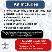 Inside, you’ll get an Inlay base, Inlay plug, cutting board oil, rubber feet with screws, and a stainless steel brush — plus three digital designs (3D pattern, USA theme, and deer profile). Ryan will guide you step-by-step in the included build video, and the commercial license lets you legally sell what you make.