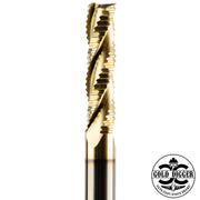 Part of the "Gold Digger Family" of bits, the Golden Boy is the ultimate upcut CNC bit for speed, designed to cut fast, cut deep, and stay sharp. The upcut allows for chip ejection quickly! The ZrN gold coating increases the bit’s hardness and heat resistance, extending its lifespan and ensuring it powers through tough materials with ease. Perfect for roughing out large projects, Golden Boy saves time and protects your finishing bits, making it a must-have in your CNC toolkit. This bit will pay for itself time and time again! Perfect to pair with the Golden Boy XL or the Golden Girl