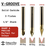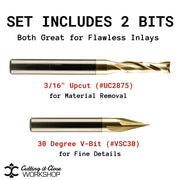 This V-Carve Inlay Bit Set includes the same 30° V-Groove bit and 3/16" upcut bit we use in all of our inlay cutting board projects. Whether you're downloading our free inlay digital file or tackling your own custom design, this set gives you everything you need for clean, tight-fitting inlays with professional results. From crisp V-carved pockets to precise male inlay cuts, these two bits work together perfectly to create stunning contrast and detail in your CNC inlay projects.